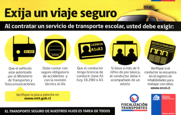 • Exigir que esté inscrito en el Registro Nacional de Transporte Escolar (RENASTRE)  lo que puede verificarse ingresando la placa patente en los sitio www.mtt.gob.cl o www.fiscalizacion.cl