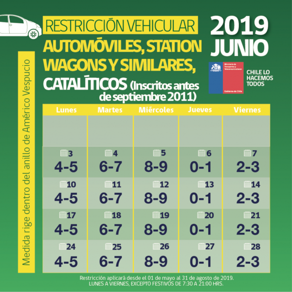 Durante este 2019 la medida establece que, en el caso de los vehículos catalíticos con sello verde inscritos antes del 1 de septiembre de 2011, se aplicará una restricción de dos dígitos diarios en el perímetro interior del anillo Américo Vespucio, de lunes a viernes entre las 7:30 y las 21 horas.